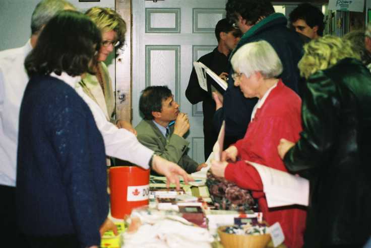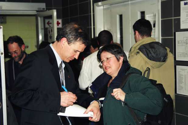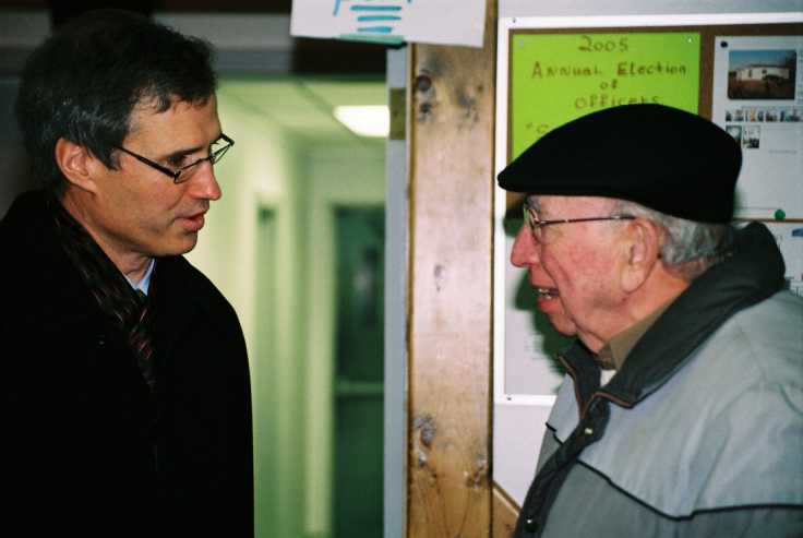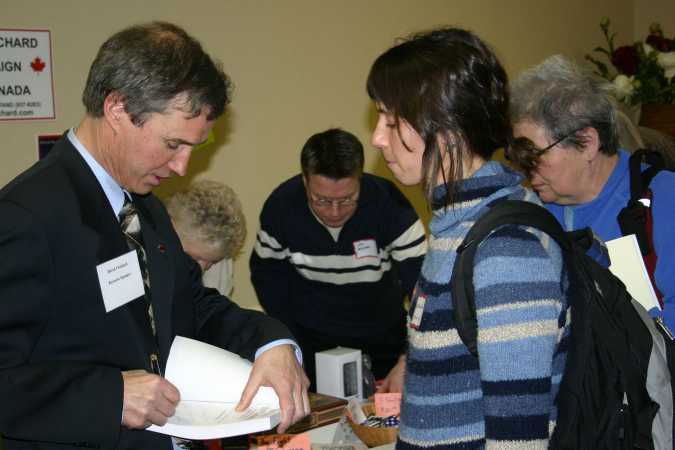 David Orchard with audience member, "Right at the Crossroads: Conflicting Visions of Conservatism in Canada," Glendon College, Toronto, March 3, 2005 |