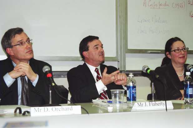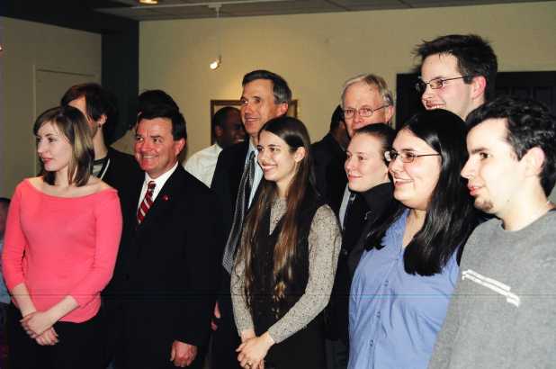 Jim Flaherty, Former Minister of Finance and Deputy Premier of Ontario, David Orchard and Glendon College student organizers of debate, "Right at the Crossroads: Conflicting Visions of Conservatism in Canada," Glendon College, Toronto, March 3, 2005 |
